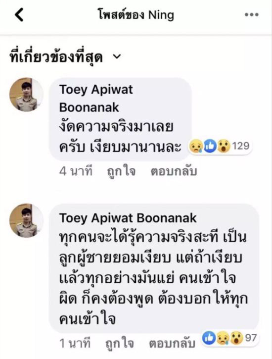 เท่านี้ยังไม่จบ ครูเต้ย ยังเข้าไปคอมเมนต์ในโพสต์ของหนิง ว่า "งัดความจริงมาเลย เงียบมานานแล้ว ทุกคนจะได้รู้ความจริงซะที เป็นลูกผู้ชายยอมเงียบ แต่ถ้าเงียบแล้วมันแย่ คนเข้าใจผิด ก็คงต้องพูดต้องบอกให้คนเข้าใจ"