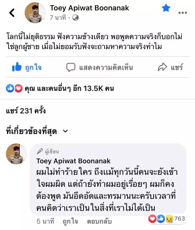 ต่อมา ครูเต้ยได้ลบโพสต์การ์ตูนวันพีซออกไป และโพสต์เฟซบุ๊ก Toey Apiwat Boonanak ระบุว่า "โลกนี้ไม่ยุติธรรม ฟังความข้างเดียว พอพูดความจริงก็บอกไม่ใช่ลูกผู้ชาย เมื่อไม่ยอมรับฟังจะถามหาความจริงทำไม ผมไม่ได้ทำร้ายใคร ถึงแม้ทุกวันนี้คนยังเข้าใจผมผิด แต่ถ้ายังทำผมอยู่เรื่อย ๆ ผมก็คงต้องพูด มันอึดอัดและทรมานนะเวลาที่คนคิดว่าเราเป็นในสิ่งที่เราไม่ได้เป็น"