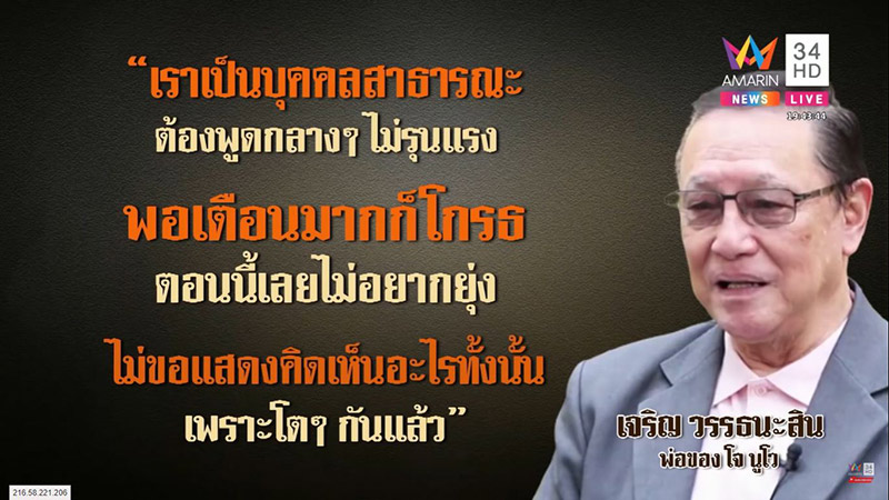 ด้าน เจริญ วรรธนะสิน พ่อของโจ เผยว่า ไม่เห็นด้วยกับคำพูดของลูกชาย ที่ผ่านมาเคยเตือนให้พูดเป็นกลาง ห้ามรุนแรง เพราะเป็นบุคคลสาธารณะ พอเตือนมากก็โกรธ ตอนนี้เลยไม่อยากยุ่งเกี่ยวกับเรื่องการเมืองที่มาจากลูกชาย ไม่ขอแสดงความเห็นใด ๆ ทั้งสิ้น โต ๆ กันแล้ว อายุ 50 กว่า ไม่ใช่เด็ก ๆ ทำอะไรก็ต้องรับผิดชอบตัวเอง