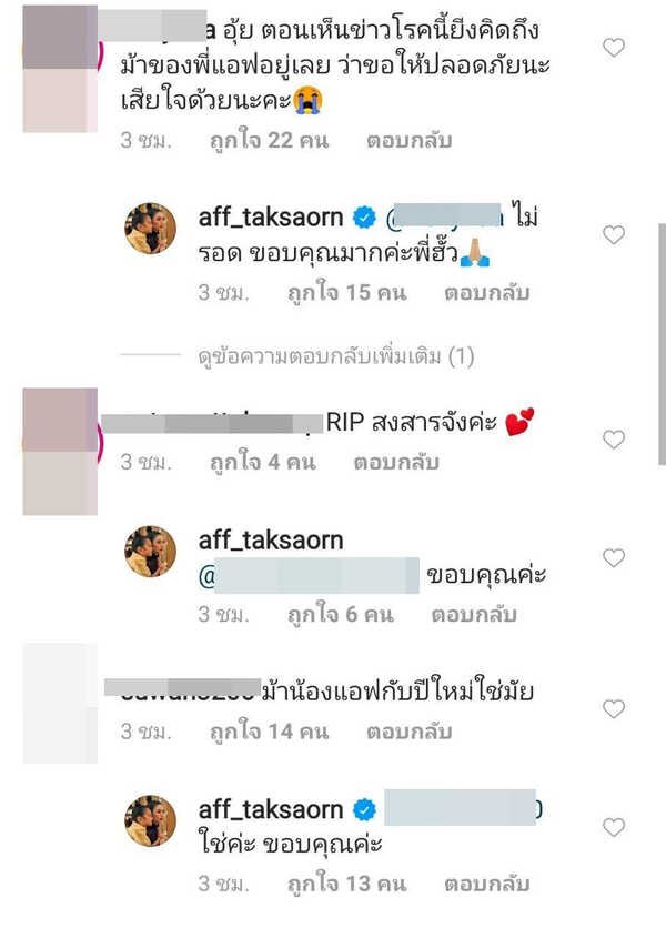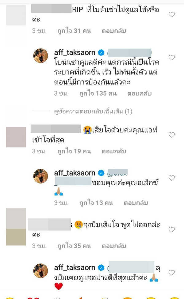 ทั้งนี้ ได้มีแฟน ๆ เข้ามาร่วมอาลัย และเมื่อมีคนคอมเมนต์ถามว่า ที่โบนันซ่าไม่ดูแลให้หรือคะ แอฟ ทักษอร ก็ได้ตอบกลับไปว่า "โบนันซ่าดูแลดีค่ะ แต่กรณีนี้เป็นโรคระบาดที่เกิดขึ้น เร็ว ไม่ทันตั้งตัว แต่ตอนนี้มีการป้องกันแล้วค่ะ"