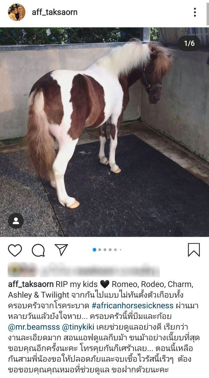 แอฟ ทักษอร โพสต์สุดอาลัย ม้าแสนรักตายเกือบทั้งครอบครัวเพราะไวรัส จากไปไม่ทันตั้งตัว ตอบกลับคนคอมเมนต์ ยันโบนันซ่าดูแลดี แต่ตอนนี้เกิดโรคระบาด