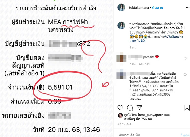ล่าสุด (20 เมษายน 2563) ตุ๊กตา กันตนา ดิษยนันทน์ ผู้จัดละครชื่อดัง ก็เจอปัญหานี้เช่นกัน โดยโพสต์ภาพสลิปจ่ายเงินค่าไฟฟ้า ที่มียอดชำระ 5,581.01 บาท พร้อมข้อความระบุว่า "อันนี้ยิ่งแปลกใหญ่ บ้านหลังนี้ไม่ได้อยู่ปิดบ้านมาเดือนกว่า คือ ไปอยู่บ้านอีกหลังแต่มีค่าไฟมา 5 พันกว่า มั่วมากนะคะ #ชีวิตคือละครละครคือชีวิต"