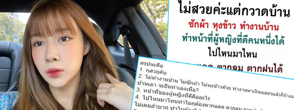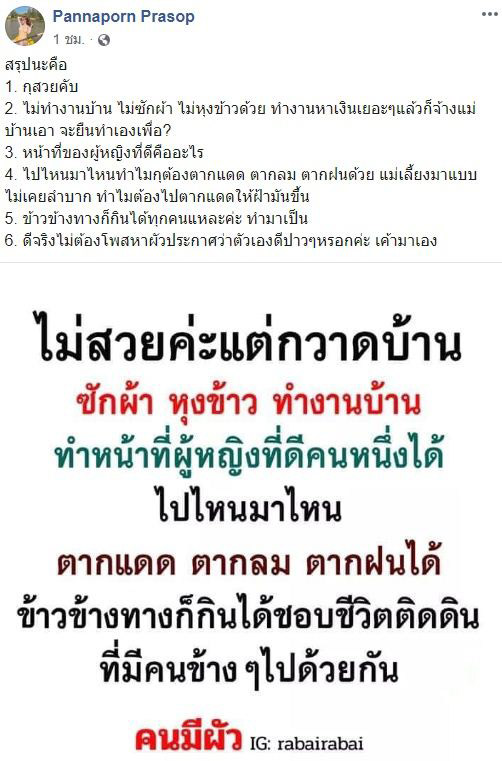 เป็นหนึ่งในสเตตัสจากเพจดังที่ถูกแชร์ในโลกออนไลน์ สำหรับโพสต์ที่ระบุว่า "ไม่สวยค่ะ แต่กวาดบ้าน ซักผ้า หุงข้าว ทำงานบ้าน ทำหน้าที่ผู้หญิงที่ดีคนหนึ่งได้ ไปไหนมาไหน ตากแดด ตากลม ตามฝนได้ ข้าวข้างทางก็กินได้ ชอบชีวิตติดดินที่มีคนข้าง ๆ ไปด้วยกัน"