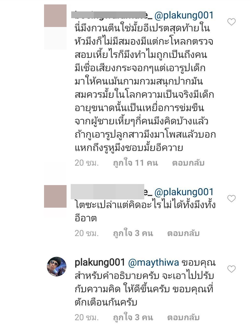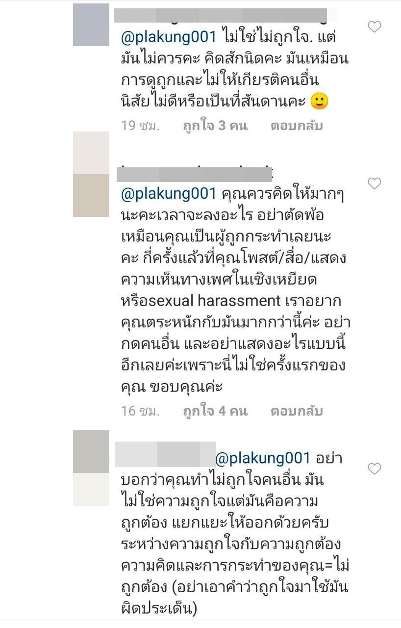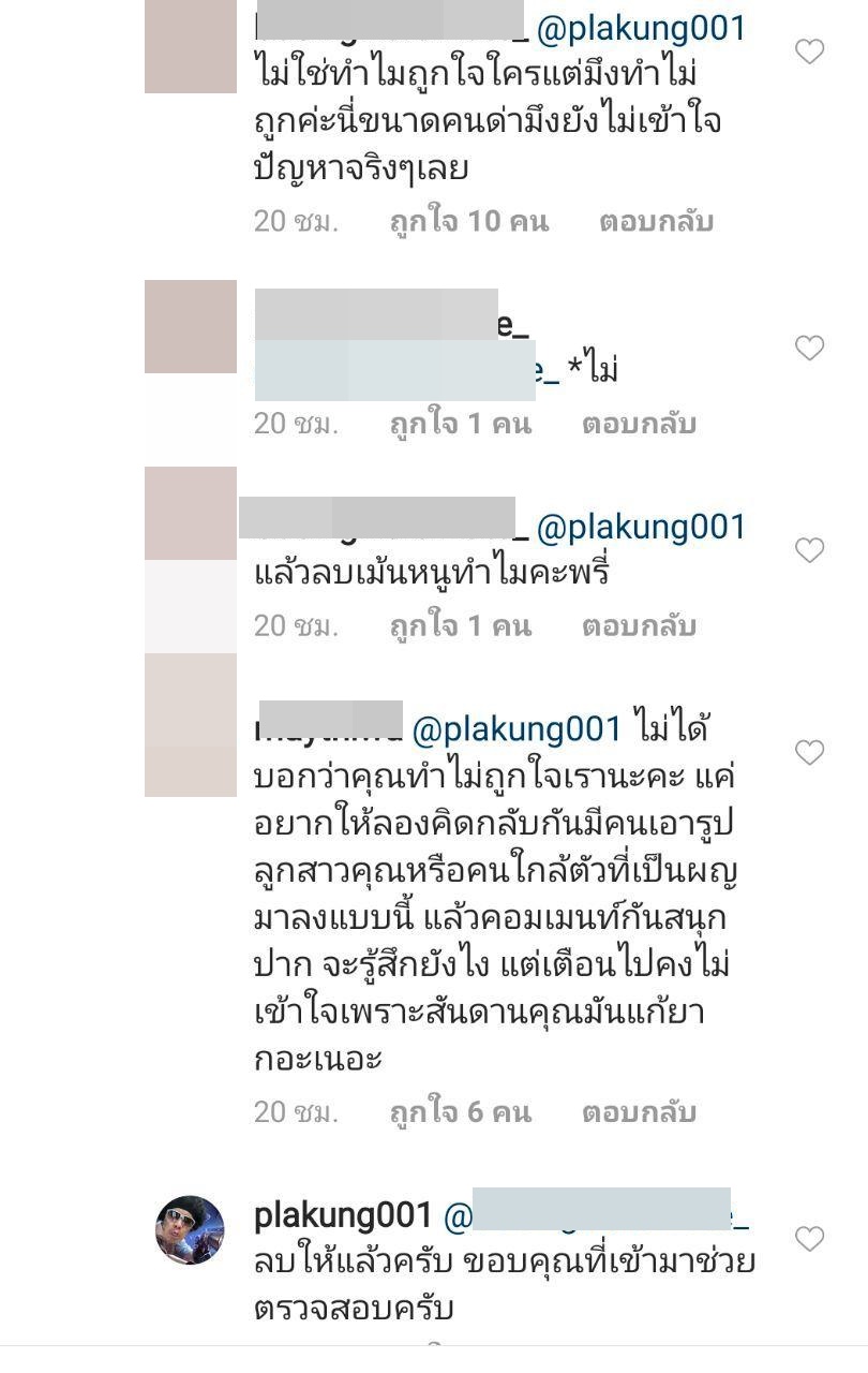 ทั้งนี้ ดีเจพล่ากุ้ง ได้ตอบกลับว่า "ถ้าผมทำไม่ถูกใจ ผมขอโทษด้วยครับ" ก่อนจะโดนคนคอมเมนต์โจมตีอีก มองว่าเรื่องดังกล่าวไม่ใช่ไม่ถูกใจ แต่สิ่งที่ทำมันไม่ถูก ไม่ควร อย่าเอาคำว่าไม่ถูกใจมาใช้ มันผิดประเด็น อยากให้คิดให้มาก ๆ เวลาจะลงอะไร เพราะเรื่องแบบนี้ก็ไม่ใช่ครั้งแรก