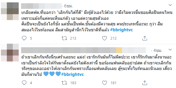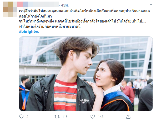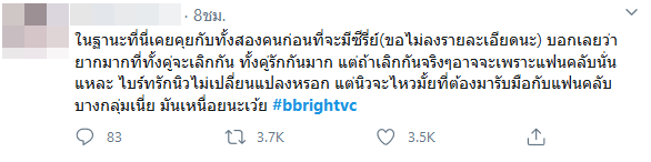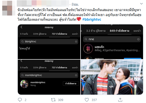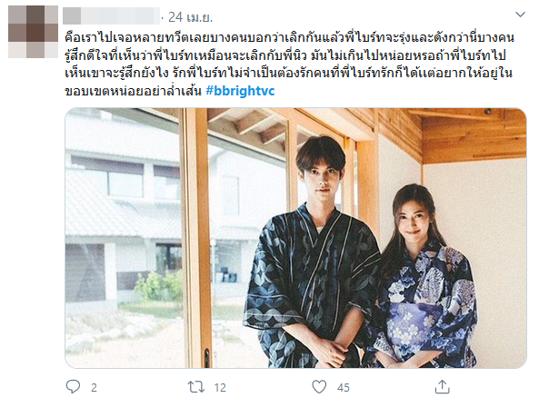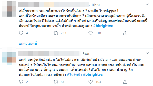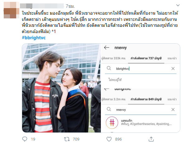 และเมื่อไม่นานมานี้ก็มีเรื่องให้คนต้องสงสัย เพราะช่วงหลังมานี้ ไบร์ท วชิรวิชญ์ ชอบแชร์เพลงเศร้าในไอจีสตอรี่ รวมไปถึงทวีตข้อความเศร้า ๆ เกี่ยวกับความทรงจำ จนคนแอบสงสัยว่าเกิดอะไรขึ้นกับความรักของเจ้าตัวหรือเปล่า แต่ก็ไม่ได้มีความเคลื่อนไหวเกี่ยวกับเรื่องนี้จากทั้งคู่ออกมา