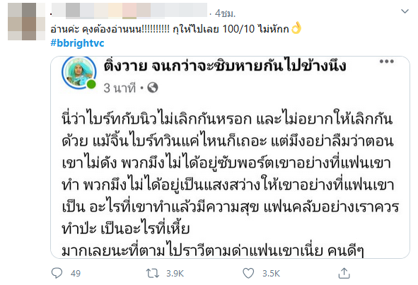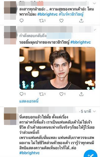 ยังมีประเด็นให้พูดถึงอยู่เรื่อย ๆ เลยทีเดียว สำหรับข่าวคราวของ ไบร์ท วชิรวิชญ์ นักแสดงหนุ่มวัยรุ่นที่กำลังโด่งดังจากซีรีส์วาย เรื่อง เพราะเราคู่กัน 2gether The Series หรือ คั่นกู กับแฟนสาวนอกวงการ นิว วีรญา หลังจากที่ก่อนหน้านี้เคยมีกรณีสงครามน้ำลายจากแอนตี้แฟนชาวจีน ที่ออกมาโจมตีฝ่ายหญิง เพราะไม่พอใจที่ศิลปินในดวงใจมีแฟน จนแทบจะกลายเป็นปัญหาระดับประเทศ สาดน้ำลายกันสนั่นทวิตเตอร์