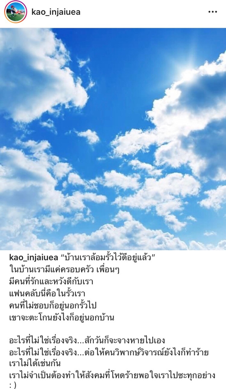ล่าสุด (20 พฤษภาคม 2563) พี่่สาวของกัน ได้โพสต์ข้อความปกป้องน้องชาย โดยระบุว่า "บ้านเราล้อมรั้วไว้ดีอยู่แล้ว ในบ้านเรามีแค่ครอบครัว เพื่อน ๆ มีคนที่รักและหวังดีกับเรา แฟนคลับนี่คือในรั้วเรา คนที่ไม่ชอบก็อยู่นอกรั้วไป เขาจะตะโกนยังไงก็อยู่นอกบ้าน อะไรที่ไม่ใช่เรื่องจริง...สักวันก็จะจางหายไปเอง อะไรที่ไม่ใช่เรื่องจริง...ต่อให้คนวิพากษ์วิจารณ์ยังไงก็ทำร้ายเราไม่ได้เช่นกัน เราไม่จำเป็นต้องทำให้สังคมที่โหดร้ายพอใจเราไปซะทุกอย่าง"