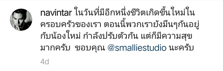 แถมล่าสุด นาวิน ต้าร์ ก็ยังเผยชุดภาพครอบครัวที่พากันไปถ่ายถึงสตูดิโอมาให้ชมกัน งานนี้จึงได้เห็นภาพสวย ๆ สุดละมุน ที่อยู่กันพร้อมหน้าพร้อมตาพ่อแม่ลูก ช่างเป็นอะไรที่อบอุ่นหัวใจจริง ๆ ค่ะ ซึ่งหนุ่ม นาวิน ต้าร์ ได้เขียนแคปชั่นประกอบภาพด้วยว่า "ในวันที่มีอีกหนึ่งชีวิตเกิดขึ้นใหม่ในครอบครัวของเรา ตอนนี้พวกเรายังมึน ๆ กันอยู่กับน้องใหม่ กำลังปรับตัวกัน แต่ก็มีความสุขมากครับ"