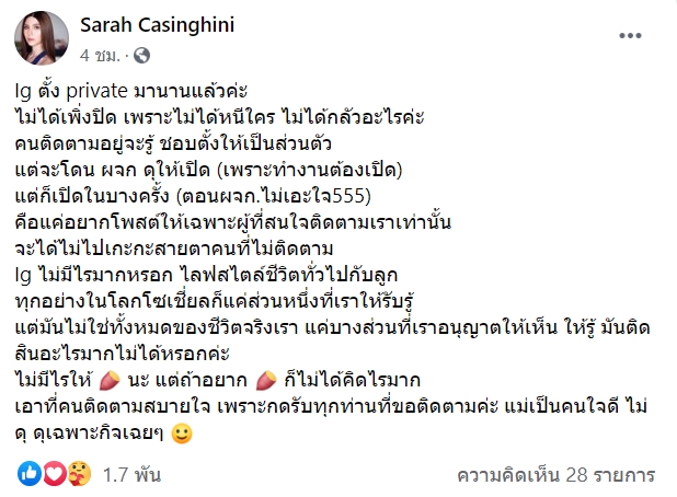 ล่าสุด (24 พฤษภาคม 2563) ซาร่า ได้โพสต์ข้อความผ่านทางเฟซบุ๊ก ระบุว่า "Ig ตั้ง private มานานแล้วค่ะ ไม่ได้เพิ่งปิด เพราะไม่ได้หนีใคร ไม่ได้กลัวอะไรค่ะ คนติดตามอยู่จะรู้ ชอบตั้งให้เป็นส่วนตัว แต่จะโดน ผจก. ดุให้เปิด (เพราะทำงานต้องเปิด) แต่ก็เปิดในบางครั้ง (ตอน ผจก. ไม่เอะใจ 555) คือแค่อยากโพสต์ให้เฉพาะผู้ที่สนใจติดตามเราเท่านั้น จะได้ไม่ไปเกะกะสายตาคนที่ไม่ติดตาม