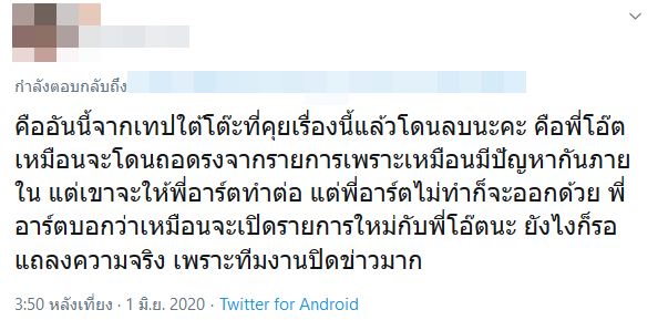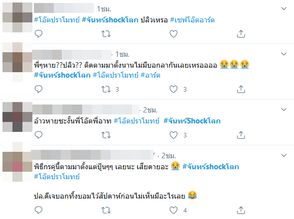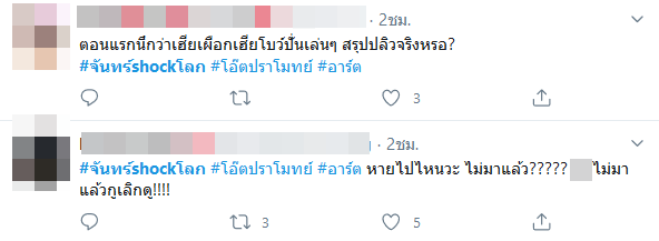 อย่างไรก็ตาม เมื่อเข้าไปดูในกระแสโซเชียลทั้งในทวิตเตอร์และคอมเมนต์ระหว่างออนแอร์รายการ จันทร์ Shock โลก หลายคนก็สงสัยไปในทำนองเดียวกันว่า โอ๊ต และ อาร์ต โดนเด้งเหรอ ปลิวหรือเปล่า ซึ่งหลายคนก็มองว่าน่าจะสืบเนื่องมาจากการจัดรายการเมื่ออาทิตย์ที่แล้วจริง ๆ รวมไปถึงมีการพูดถึงเทปรายการก่อนหน้านี้ที่ถูกลบออกไปแล้ว นอกจากนี้ยังมีข่าวลือว่ามีปัญหากันภายใน ซึ่งต้องรอให้ทางต้นสังกัดออกมาแถลงอีกที