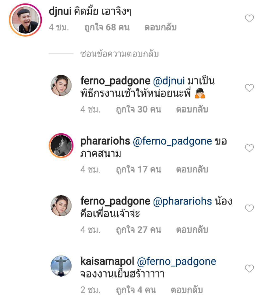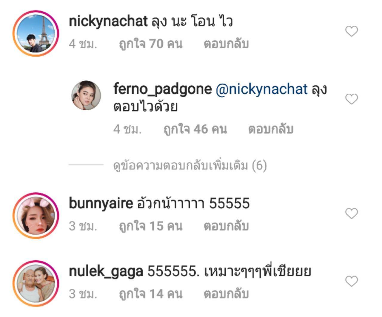 ขณะที่ สาวใบเฟิร์น ก็ไม่น้อยหน้า ลงภาพที่ตัวเองโดน นิกกี้ หอมแก้ม พร้อมข้อความว่า "รูป เรียก ไลก์" จน ดีเจนุ้ย ถึงกับเข้ามาถามว่า "คิดมั้ย เอาจิง ๆ" ซึ่งเจ้าตัวก็ตอบกลับไปขำ ๆ ว่า มาเป็นพิธีกรงานเช้าให้หน่อย แถมยังคอมเมนต์แซวกับนิกกี้ เรียกแทนกันว่า ลุง