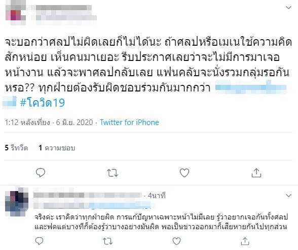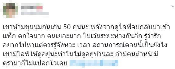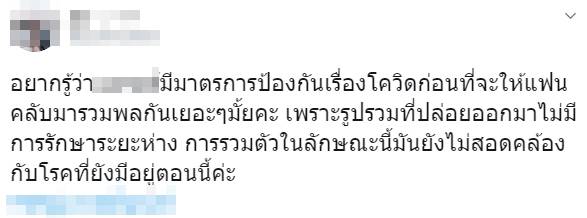 โดยคนที่เห็นภาพที่ถ่ายรวมกลุ่ม ต่างทวงถามถึงมาตรการป้องกันโรคโควิด-19 ว่าผู้จัดมีการป้องกันหรือไม่ และมีเหตุจำเป็นใดที่แฟนคลับต้องเดินทางไปที่สถานที่จัดงาน ทั้ง ๆ ที่จุดประสงค์ของการไลฟ์ก็บอกชัดเจนอยู่แล้วว่าต้องการให้ดูที่บ้าน และเมื่อภาพออกมาแบบนี้ เห็นแฟนคลับเบียดเสียดกัน จึงน่าเป็นห่วงว่าทำไมไม่มีการเว้นระยะห่างเลย ทั้ง ๆ ที่สถานการณ์ covid 19 ยังคงต้องระมัดมัดระวังอยู่
