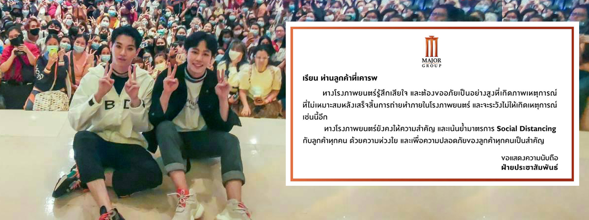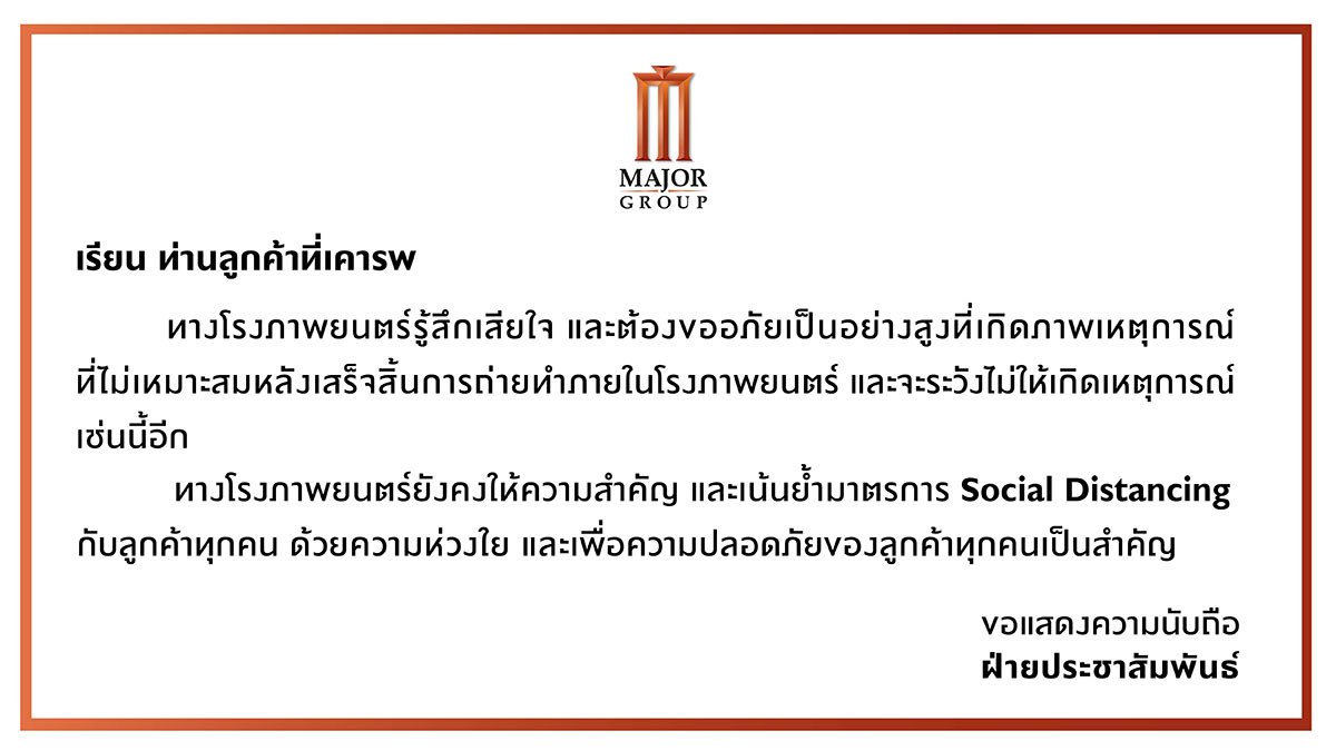 ล่าสุด (6 มิถุนายน 2563) Major Group ได้ออกหนังสือชี้แจงว่า ทางโรงภาพยนตร์รู้สึกเสียใจและขออภัยเป็นอย่างสูง ที่เกิดภาพเหตุการณ์ ที่ไม่เหมาะสมหลังเสร็จการถ่ายทำภายในโรงภาพยนตร์ และจะระวังไม่ให้เกิดเหตุการณ์เช่นนี้อีก ทั้งนี้ ทางโรงภาพยนตร์ยังคงให้ความสำคัญและเน้นย้ำ Social Distancing กับลูกค้าทุกคน ด้วยความห่วงใยและเพื่อความปลอดภัยของลูกค้าทุกคนเป็นสำคัญ