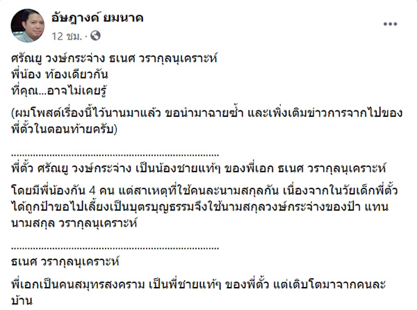 วันที่ 11 มิถุนายน 2563 ผู้ใช้เฟซบุ๊ก อัษฎางค์ ยมนาค นักประวัติศาสตร์ ได้มีการเผยเรื่องราวชีวิตของนักแสดงและผู้กำกับชื่อดังผู้ล่วงลับ ตั้ว ศรัณยู วงษ์กระจ่าง หลังจากไปด้วยโรคมะเร็งตับในวัย 59 ปี (อ่านข่าวเพิ่มเติม คลิก) ที่หลายคนอาจไม่เคยรู้มาก่อน