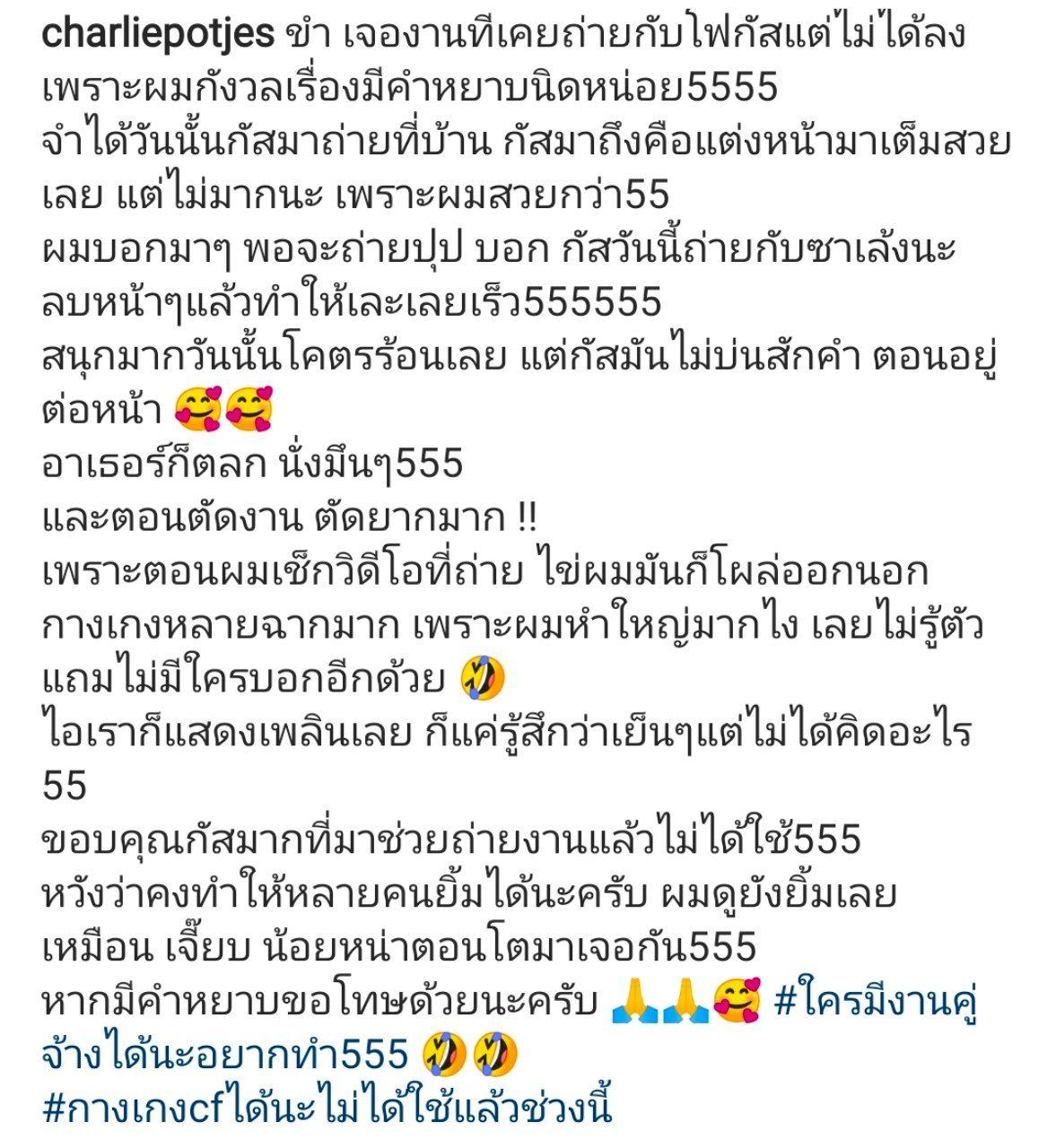 "ขำ เจองานทีเคยถ่ายกับโฟกัสแต่ไม่ได้ลง เพราะผมกังวลเรื่องมีคำหยาบนิดหน่อย 5555 จำได้วันนั้นกัสมาถ่ายที่บ้าน กัสมาถึงคือแต่งหน้ามาเต็มสวยเลย แต่ไม่มากนะ เพราะผมสวยกว่า 55 ผมบอกมา ๆ พอจะถ่ายปุ๊บ บอก กัสวันนี้ถ่ายกับซาเล้งนะ ลบหน้า ๆ แล้วทำให้เละเลยเร็ว 555555