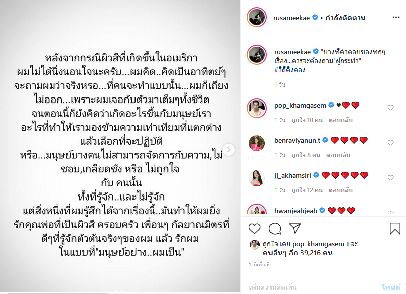และจากข่าวดังกล่าวก็ทำให้คนบันเทิงหลายคนทั้งในไทยและต่างประเทศถูกจับตามองไม่น้อยว่าจะออกมาเคลื่อนไหวเกี่ยวกับเรื่องนี้หรือไม่ ล่าสุด (16 มิถุนายน 2563) รัศมีแข ฟ้าเกื้อล้น นักแสดงลูกครึ่งไทย-อเมริกัน ก็ได้ออกมาพูดถึงเรื่องนี้ด้วยเช่นกัน โดยเจ้าตัวได้โพสต์ข้อความผ่านอินสตาแกรมส่วนตัว ระบายความในใจของคนผิวสีที่โดนเหยียดมาทั้งชีวิต พร้อมแคปชั่นว่า "บางทีคำตอบของทุก ๆ เรื่อง...ควรจะต้องถาม "ผู้กระทำ" #วิถีคิงคอง"