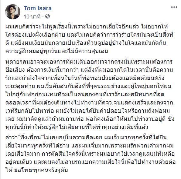 จากนั้น ทอม อิศรา ก็ได้โพสต์ข้อความผ่านเฟซบุ๊กของตัวเอง เผยถึงสาเหตุที่ทำให้ตัดสินใจแยกวงเป็นครั้งแรก ดังนี้