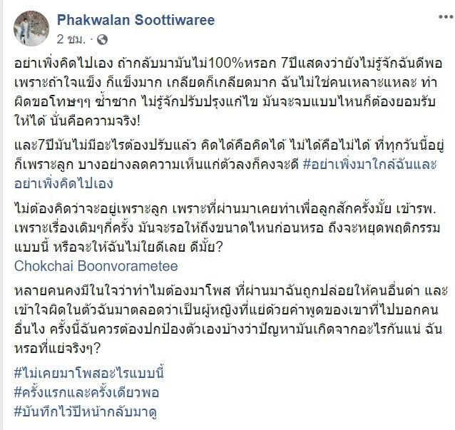 หลายคนคงมีในใจว่าทำไมต้องมาโพสต์ ที่ผ่านมาฉันถูกปล่อยให้คนอื่นด่า และเข้าใจผิดในตัวฉันมาตลอดว่าเป็นผู้หญิงที่แย่ด้วยคำพูดของเขาที่ไปบอกคนอื่นไง ครั้งนี้ฉันควรต้องปกป้องตัวเองบ้างว่าปัญหามันเกิดจากอะไรกันแน่ ฉันเหรอที่แย่จริง ๆ ?
