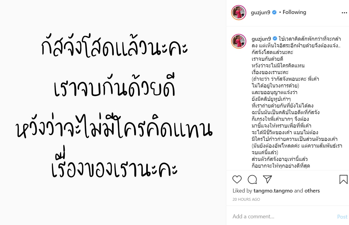 "ใช้เวลาคิดสักพักกว่าที่จะกล้าลง แต่เห็นใจอิสระอีกฝ่ายด้วยจึงต้องแจ้ง.. กัสจังโสดแล้วนะคะ เราจบกันด้วยดี หวังว่าจะไม่มีใครคิดแทนเรื่องของเรานะคะ (ถ้าจะว่า ว่ากัสจังพอนะคะ พี่เค้าไม่ได้อยู่ในวงการด้วย) และขออนุญาตแจ้งว่า ยังมีคลิปยูทูบเก่า ๆ ที่เราถ่ายด้วยกันที่ยังไม่ได้ลง ฉะนั้นมันเป็นคลิปในอดีตที่กัสจังก็เกรงใจพี่เค้ามาก ๆ จึงต้องมาชี้แจงให้ทราบเพื่อที่พี่เค้าจะได้มีชีวิตของเค้า แบบไม่ต้องมีใครไปก้าวก่ายความเป็นส่วนตัวของเค้า (มันยังต้องอัปโหลดค่ะ แต่ความสัมพันธ์เราจบแค่นี้แล้ว)