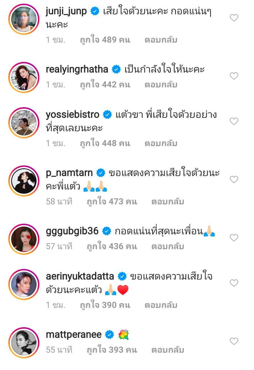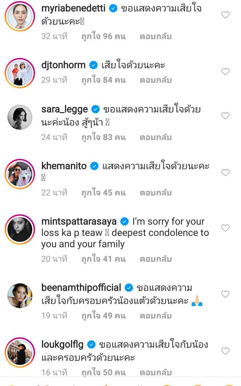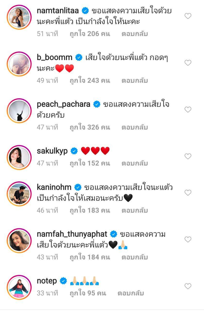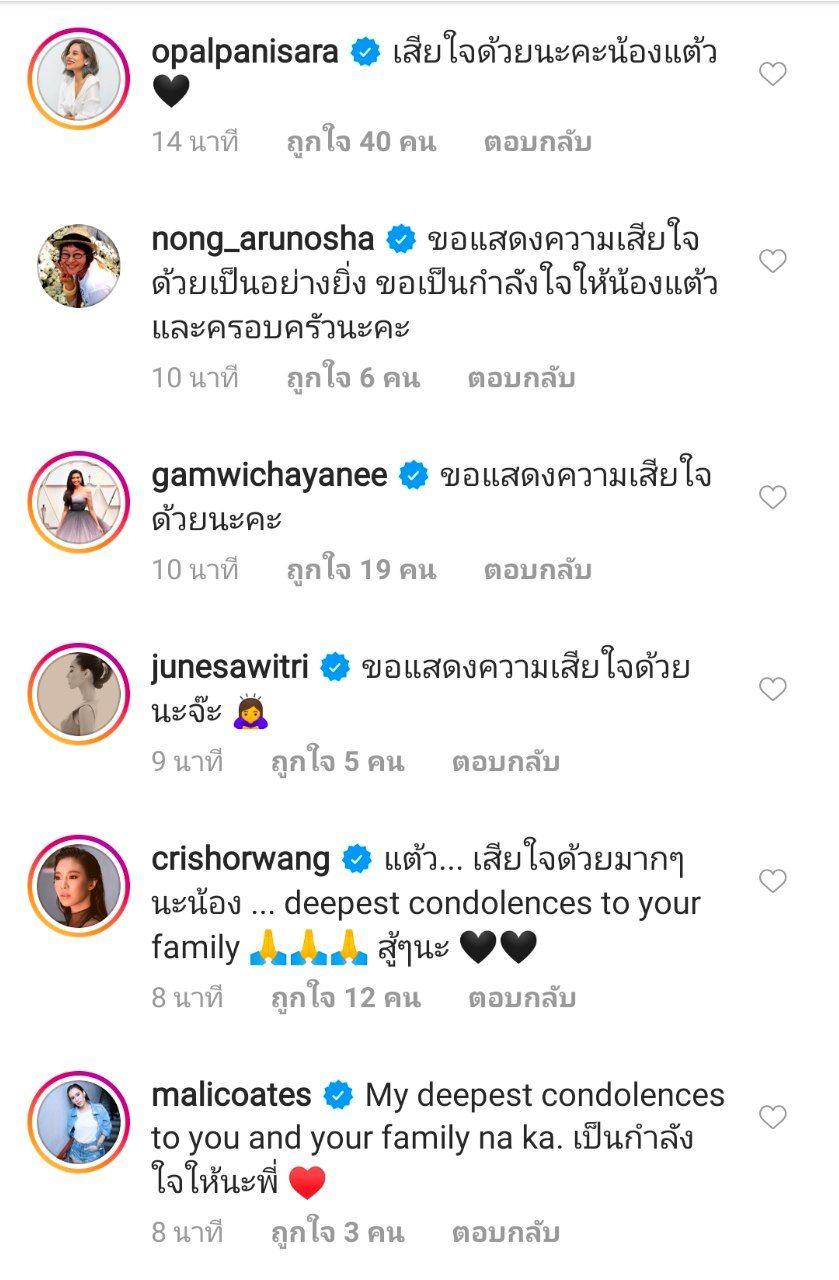 ทั้งนี้ ได้มีแฟน ๆ และเพื่อน ๆ ในวงการบันเทิง เข้ามาคอมเมนต์ร่วมแสดงความเสียใจ พร้อมทั้งส่งกำลังใจให้ แต้ว ณฐพร และครอบครัว กันเป็นจำนวนมาก อาทิ ญาญ่า อุรัสยา, เจมส์ จิรายุ, ต้น อาชว์, เบลล่า ราณี, แพท ณปภา, จุ๋ย วรัทยา, เต้ย จรินทร์พร, บอย ปกรณ์, เจนี่ เทียนโพธิ์สุวรรณ, แมท ภีรนีย์, ใหม่ ดาวิกา, พีช พชร ฯลฯ