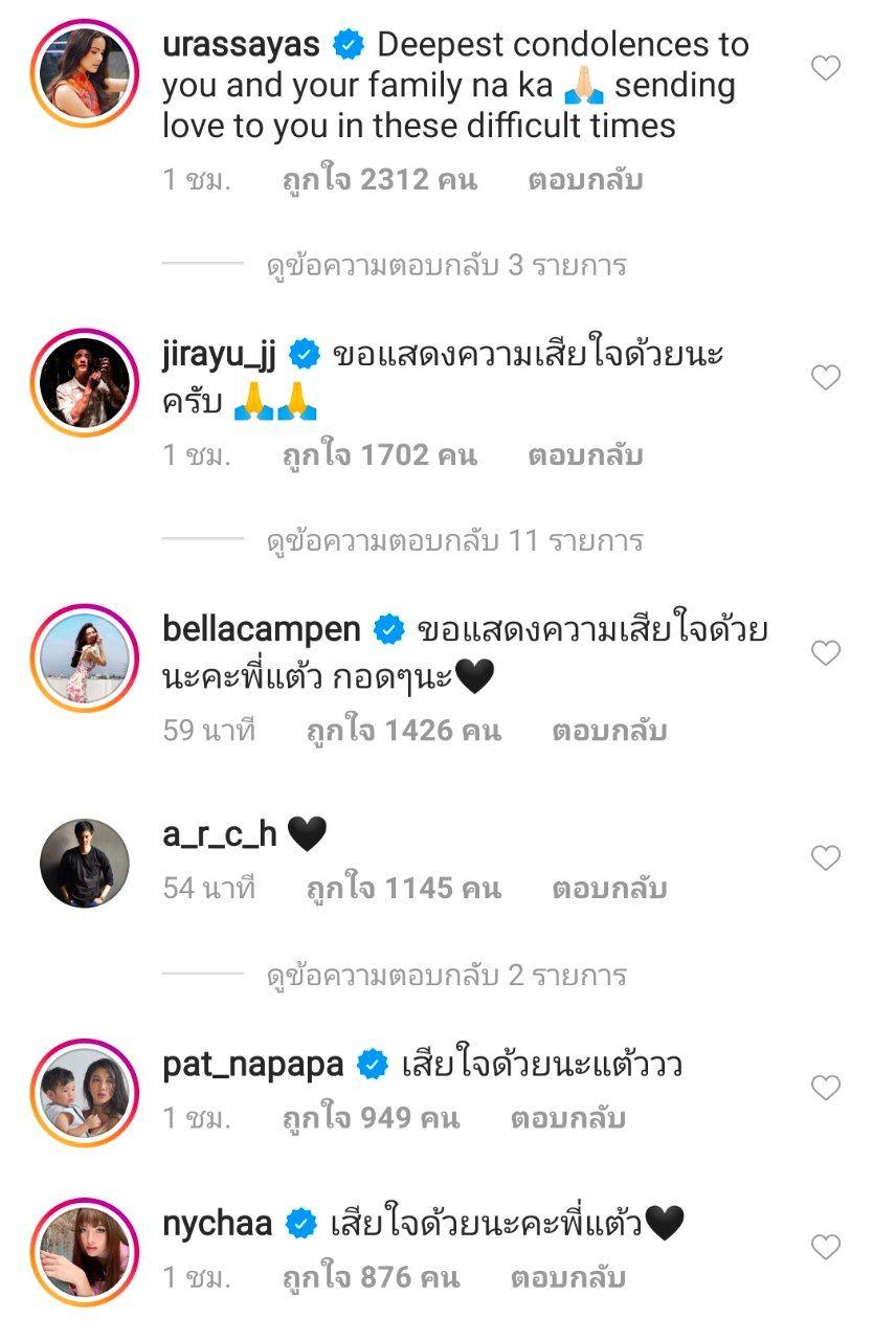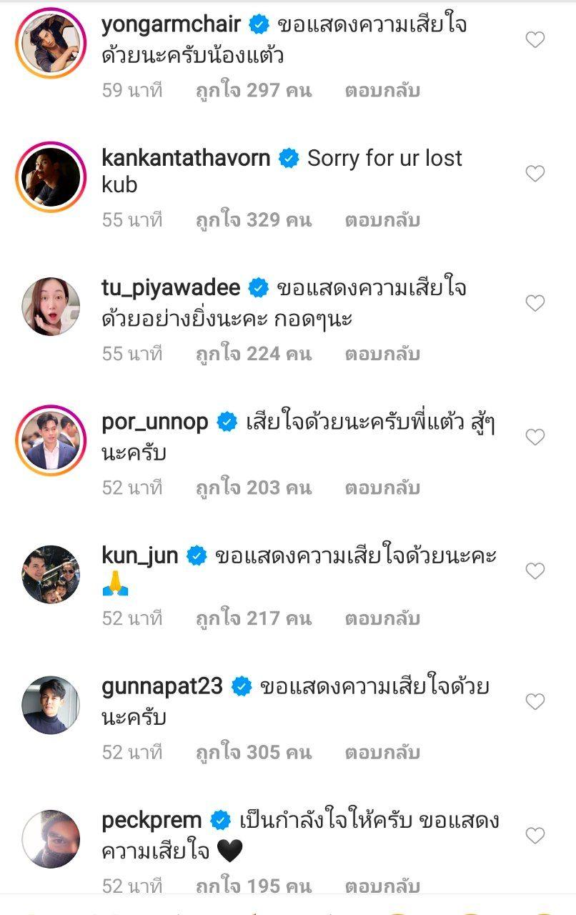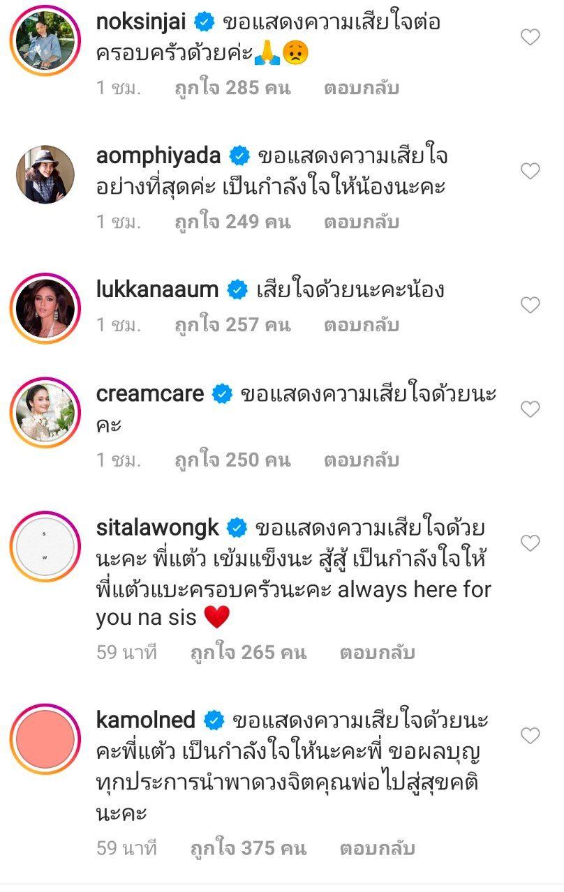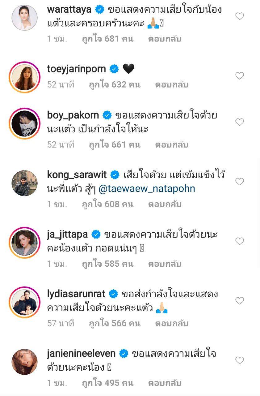 ทั้งนี้ ได้มีแฟน ๆ และเพื่อน ๆ ในวงการบันเทิง เข้ามาคอมเมนต์ร่วมแสดงความเสียใจ พร้อมทั้งส่งกำลังใจให้ แต้ว ณฐพร และครอบครัว กันเป็นจำนวนมาก อาทิ ญาญ่า อุรัสยา, เจมส์ จิรายุ, ต้น อาชว์, เบลล่า ราณี, แพท ณปภา, จุ๋ย วรัทยา, เต้ย จรินทร์พร, บอย ปกรณ์, เจนี่ เทียนโพธิ์สุวรรณ, แมท ภีรนีย์, ใหม่ ดาวิกา, พีช พชร ฯลฯ