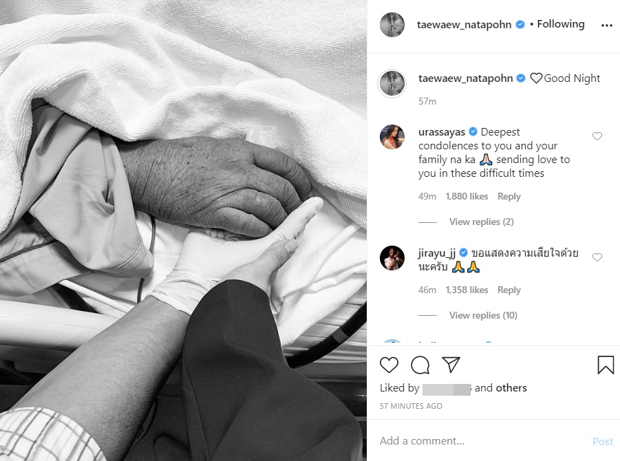 โดยล่าสุด แต้ว ณฐพร ก็ได้โพสต์ภาพขณะร่วมกุมมือคุณพ่อ ที่นอนอยู่บนเตียงผู้ป่วย พร้อมข้อความอำลาแบบสั้น ๆ แต่เปี่ยมไปด้วยความรู้สึกว่า "Good Night"