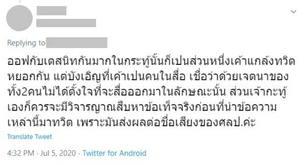 โดยทวิตเตอร์ดังกล่าวโพสต์ภาพพร้อมแคปชั่นว่า "ในใจพนักงานห้าง ตอนแกล้งสแกนไทยชนะ" ซึ่งหนุ่มเตก็มีการแท็กถึงเพื่อนรักอย่างหนุ่มออฟ ขณะที่ออฟเข้ามาตอบกลับว่า "ก็ว่าเนียนละนะ" จากบทสนทนาดังกล่าวนี้เองที่ทำให้ผู้ใช้ทวิตเตอร์รายหนึ่งรู้สึกไม่พอใจ และแคปข้อความออกมาตำหนิว่า ดาราควรจะเป็นแบบอย่างให้กับสังคม แต่ก็ไม่มีใครห้ามใครเลย และรู้สึกผิดหวังที่แฟนคลับบางคนเห็นดีเห็นงามตามไปด้วย ซึ่งหลายคนก็เห็นด้วย