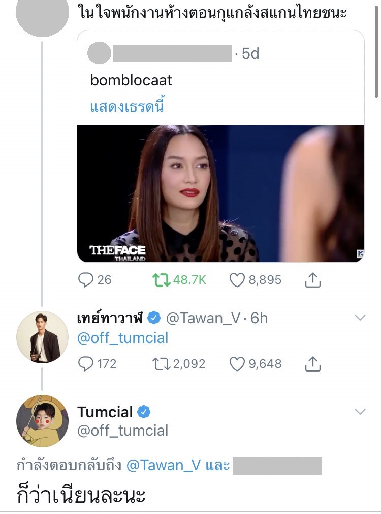 ดูเหมือนสองพระเอกหนุ่มซีรีส์วาย เต ตะวัน และ ออฟ จุมพล จะงานเข้าซะแล้ว เมื่อล่าสุด (5 กรกฎาคม 2563) มีผู้ใช้ทวิตเตอร์รายหนึ่งแคปข้อความที่สองหนุ่มสนทนากันเรื่องทวิตเตอร์ที่โพสต์ขำ ๆ ถึงเรื่องการแกล้งสแกนคิวอาร์โค้ด ไทยชนะ เวลาเดินเข้า-ออกห้างสรรพสินค้าเอาไว้