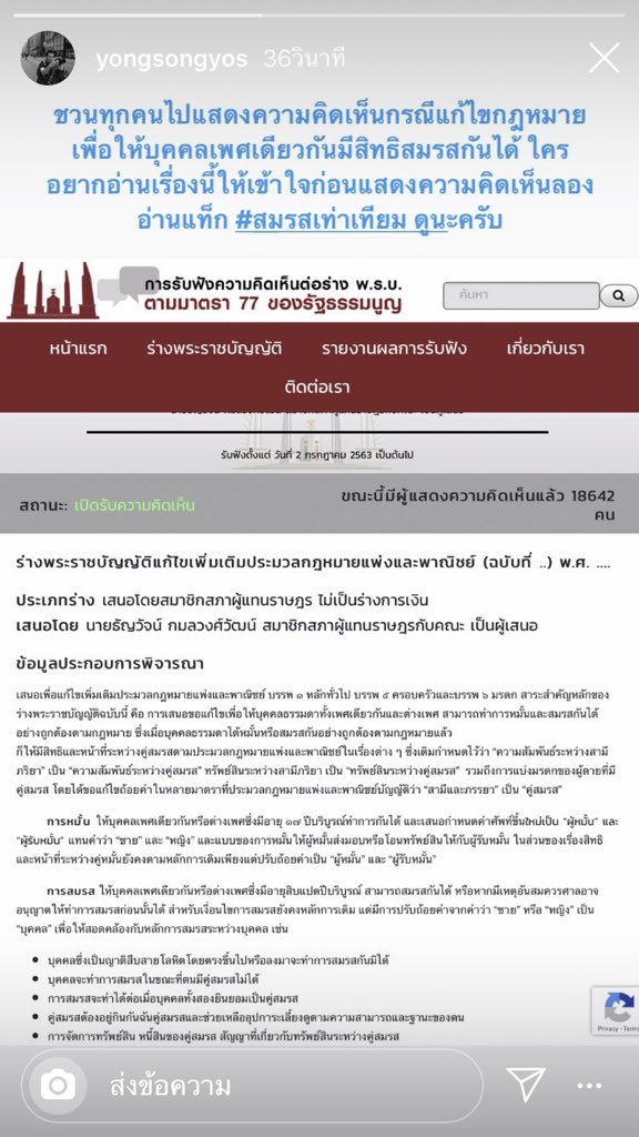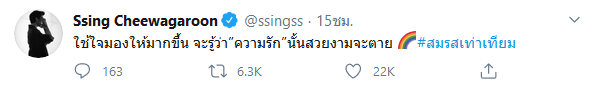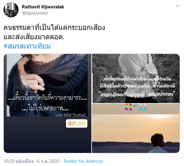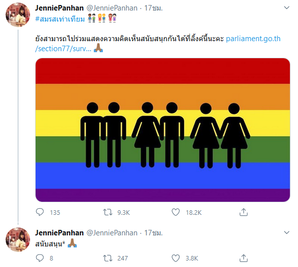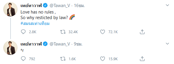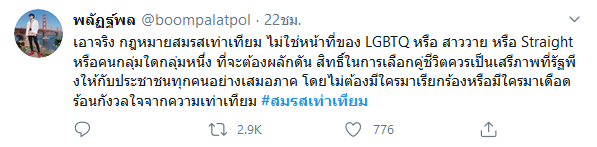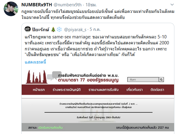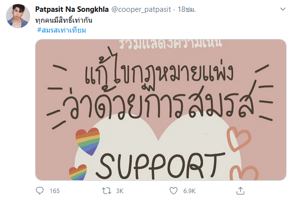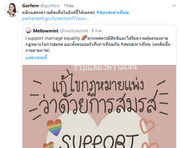 จากกรณีที่คนในโลกออนไลน์ต่างพากันติดแฮชแท็ก #สมรสเท่าเทียม ในทวิตเตอร์ เพื่อให้ความรู้เกี่ยวกับการผลักดัน ร่างพระราชบัญญัติแก้ไขเพิ่มเติมประมวลกฎหมายแพ่งและพาณิชย์ (ฉบับที่ ..) พ.ศ. .... ว่าด้วยการให้บุคคลธรรมดาทั้งเพศเดียวกันและต่างเพศ สามารถทำการหมั้นและสมรสกันได้อย่างถูกต้องตามกฎหมาย ซึ่งก็มีคนออกมาแสดงความคิดเห็นและร่วมรณรงค์ให้ข้อกฎหมายดังกล่าวผ่านร่างกันเป็นจำนวนมาก จนแฮชแท็กดังกล่าวติดเทรนด์ประเทศไทย