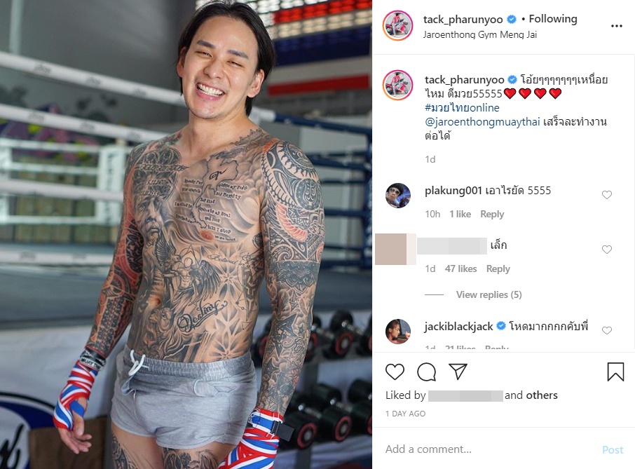 แทค ภรัณยู ลงภาพหลังซ้อมมวย ถอดเสื้อโชว์หุ่นล่ำ กับรอยสักทั้งตัว แต่ทำเอาหลายคนหลุดโฟกัส เพราะบางส่วนแย่งซีน กางเกงสั้นจริง !