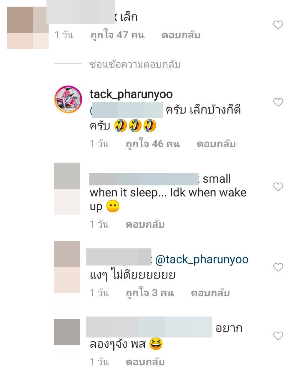 นอกจากนี้ยังมีความพีค เมื่อมีคนคอมเมนต์ทักว่า "เล็ก" หนุ่มแทค เลยตอบกลับไปแบบขำ ๆ ว่า "ครับ เล็กบ้างก็ดีครับ" เรียกเสียงฮาได้กระจายเลยทีเดียว