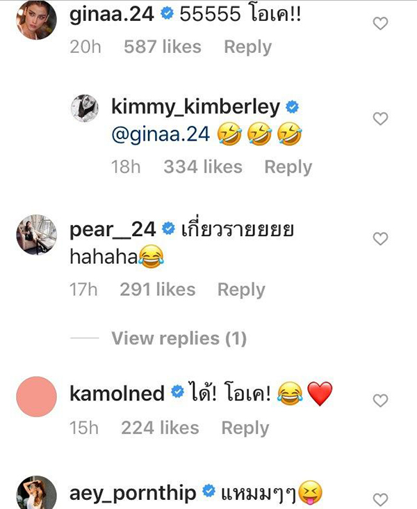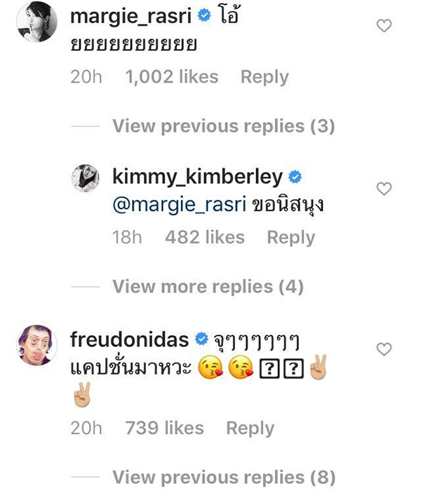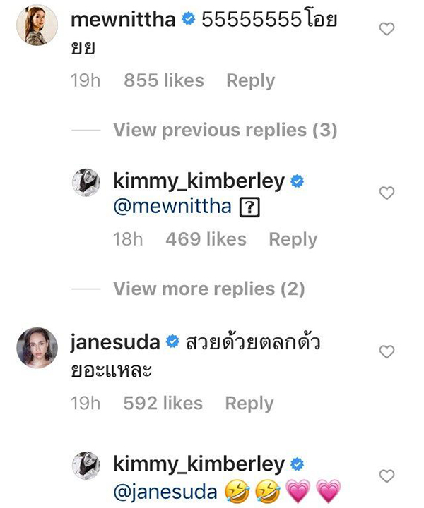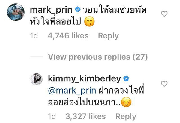 โดยล่าสุด (11 กรกฎาคม 2563) คิมเบอร์ลี่ ได้โพสต์ภาพแฟชั่นกลางดงต้นไม้ใบเขียวลงในอินสตาแกรม ที่มาพร้อมแคปชั่นเด็ด สาดความหวานใส่หนุ่ม หมาก ปริญ ว่า "ถึงยุงกัดน้องจนขาลาย แต่น้องก็ไม่วายรักพี่คนเดียว ตึงงงงงง !! #เกี่ยวไรรรร" งานนี้ทำเอาเพื่อนดาราแห่แซวกันสนั่น