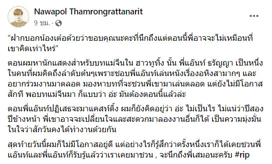 ตอนพี่แอ๊นท์ปฏิเสธจะมาแคสติ้ง ผมก็ยังคิดอยู่ว่า อะ ไม่เป็นไร ไม่แน่ว่าปีสองปีข้างหน้า พี่เขาอาจจะเปลี่ยนใจ และสะดวกมาลองงานอื่นก็ได้ เป็นความมุ่งมั่นในใจว่าสักวันคงได้ทำงานด้วยกัน สุดท้ายวันนี้ผมก็ไม่มีโอกาสอยู่ดี แต่อย่างไรก็รู้สึกว่า ครั้งหนึ่งเราก็ได้เคยชวนพี่แอ๊นท์ และพี่แอ๊นท์ก็รับรู้แล้วว่า เราเคยมาชวน จะนึกถึงพี่เสมอนะครับ #rip"