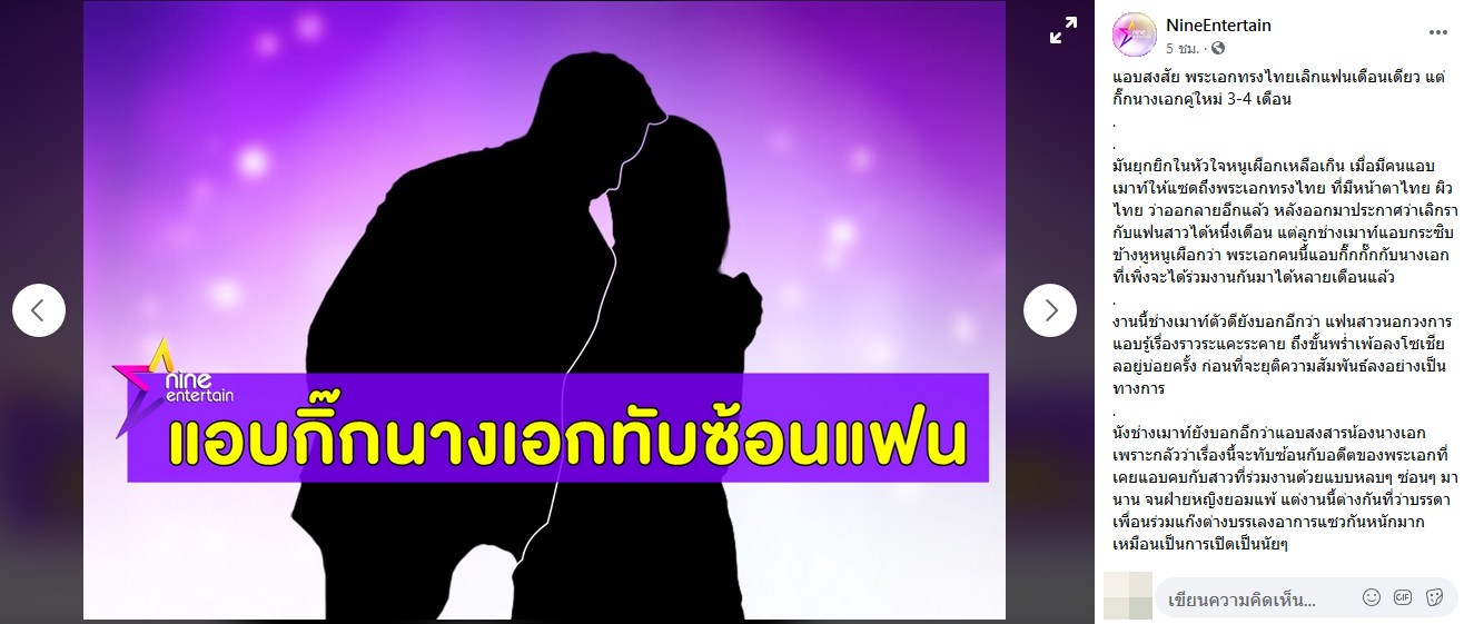 มีข่าวเมาท์แซ่บ ๆ มาให้ขาเผือกได้ตามสืบกันอีกแล้ว สำหรับเรื่องแซ่บ ๆ ในวงการบันเทิง ที่ล่าสุด (20 กรกฎาคม 2563) ไนน์เอ็นเตอร์เทน ได้ออกมาเมาท์ว่า พระเอกทรงไทยออกลายอีกแล้ว หลังออกมาประกาศว่าเลิกรากับแฟนสาวได้หนึ่งเดือน แต่ก็มีคนแอบกระซิบว่า พระเอกคนนี้แอบกิ๊กกั๊กกับนางเอกที่เพิ่งจะได้ร่วมงานกันมาหลายเดือนแล้ว ส่วนทางอดีตแฟนสาวนอกวงการก็แอบรู้เรื่องราวระแคะระคาย พร่ำเพ้อลงโซเชียลอยู่บ่อยครั้ง ก่อนที่จะยุติความสัมพันธ์กัน