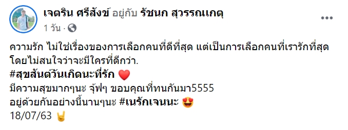 เรียกว่าเปิดตัวว่ามีแฟนแล้ว สำหรับนักร้องสาว เจนนี่ ได้หมดถ้าสดชื่น ซึ่งเจ้าตัวมักลงภาพคู่กับแฟนหนุ่มอยู่ตลอด แต่ล่าสุด (20 กรกฎาคม 2563) มีดราม่าซะแล้ว เมื่อ เนเงิน เจตริน แฟนของสาวเจนนี่ ได้โพสต์ภาพสวีตในทริปเที่ยวทะเล ซึ่งมีภาพหนึ่งทั้งคู่กำลังจูบกัน
