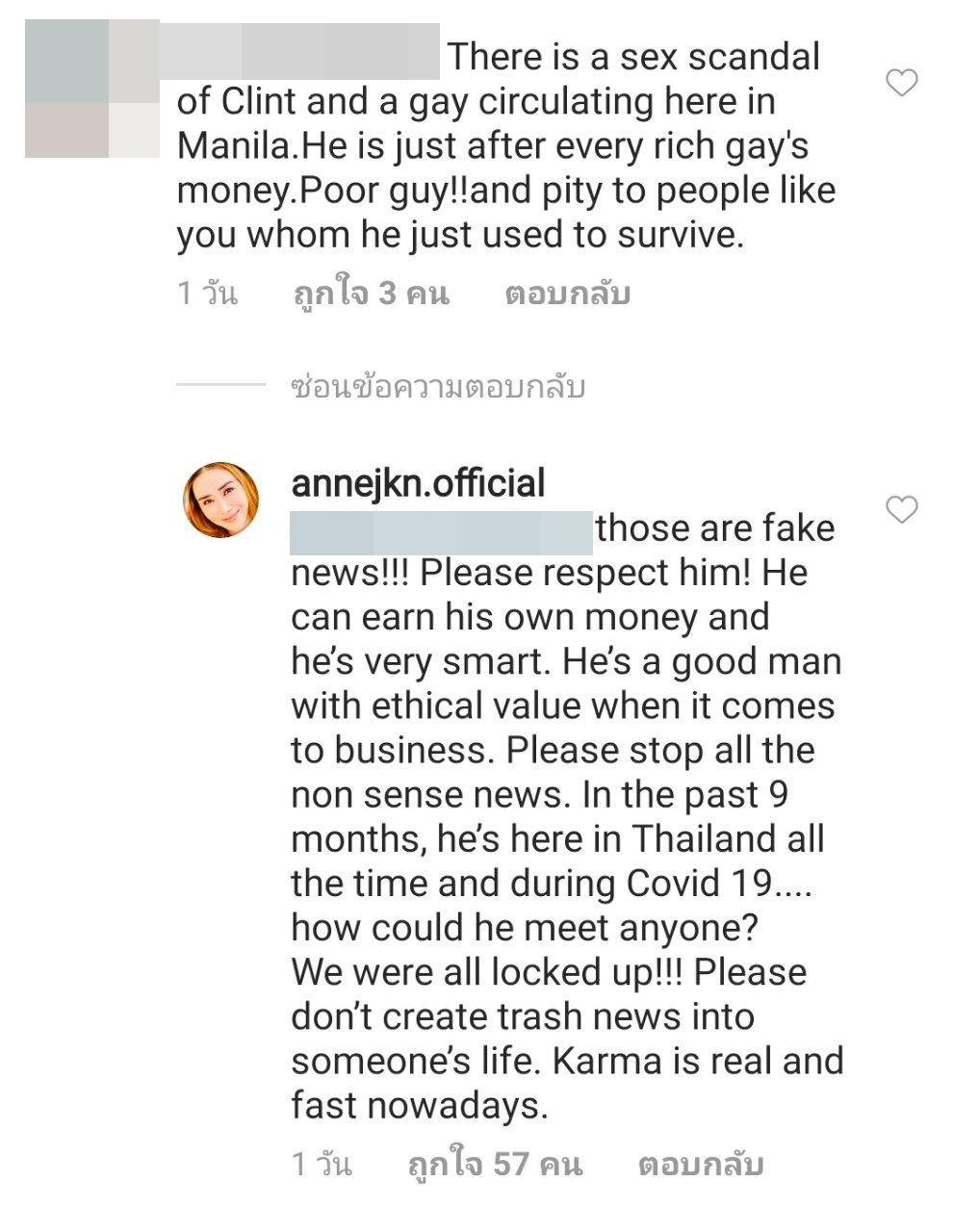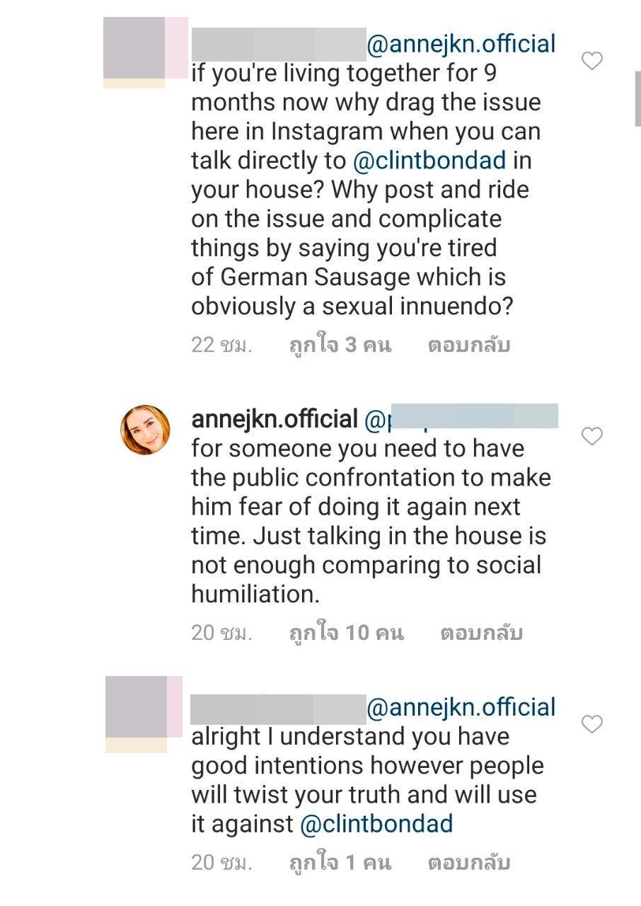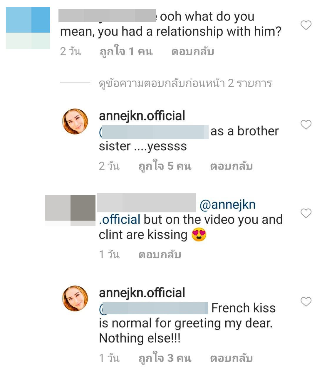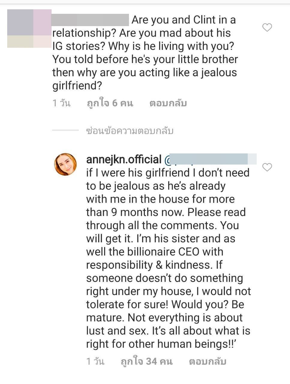 มีหลายคนที่เห็นโพสต์ดังกล่าวแล้วยิ่งสงสัยในความสัมพันธ์ของ แอน JKN และ คลินต์ บอนแดด จนเข้ามาคอมเมนต์สอบถามกันเพียบ ซึ่ง แอน ก็ได้ตอบกลับแบบชัดเจน อาทิ