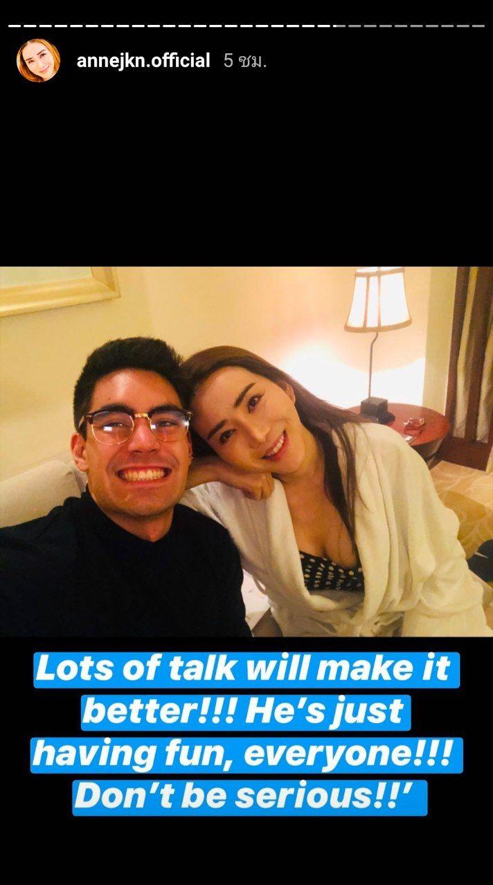 ต่อมา แอน JKN ก็ลงภาพคู่กับ คลินต์ บอนแดด ใน IG Story แบบรัว ๆ อัปเดตว่าฝ่ายชายมาเจอกันที่บ้านของคุณพ่อ และการพูดคุยกันทำให้เขาดีขึ้น เขาแค่ทำไปขำ ๆ ทุกคนอย่าซีเรียส หลายคนถามว่าเขาปกติหรือเปล่า แอน ก็เข้ามาตอบว่า ใช่.. น้องชายของฉันปกติมาก ฉันจะดูแลเขาเอง ไม่ต้องเป็นห่วง ก่อนจะลงรูปที่ทั้งคู่ไปเข้าวัด ทำบุญด้วยกัน