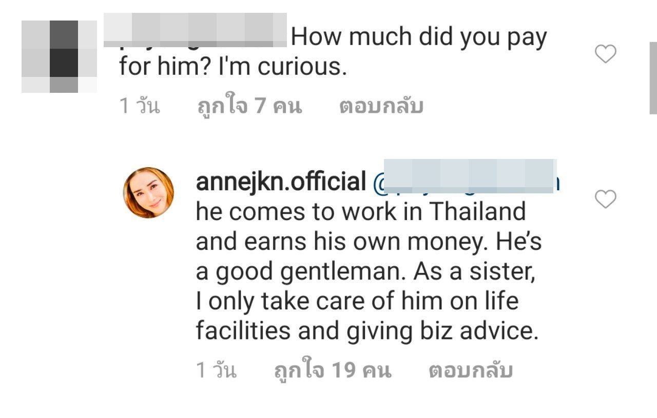 แอน JKN : เขามาทำงานที่เมืองไทย และได้รับเงินของตัวเอง เขาเป็นสุภาพบุรุษที่ดี ในฐานะที่เป็นพี่สาว ฉันแค่ดูแลเขาเรื่องความเป็นอยู่และคอยให้คำแนะนำเท่านั้น