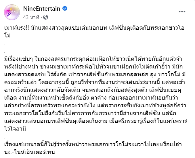 มีข่าวเมาท์มาแรงที่แซ่บไม่เบา มาฝากเหล่านักสืบดารากันอีกแล้ว เมื่อล่าสุด (21 กรกฎาคม 2563) ไนน์เอ็นเตอร์เทน ได้แย้มข่าว นักแสดงสาวสุดแซ่บเล่นนอกบท เลิฟซีนดุเดือดกับพระเอกขาวโอโม่ หลังช่างแต่งหน้า ช่างทำผม ในกองถ่าย พากันเมาท์แซ่ดว่า ฝ่ายหญิงเป็นนักแสดงสาวสุดแซ่บ ไร้สังกัด เข้าฉากเลิฟซีนกับพระเอกสุดหล่อ สูง ขาวโอโม่ คีย์เวิร์ดคือมีครอบครัวแล้ว