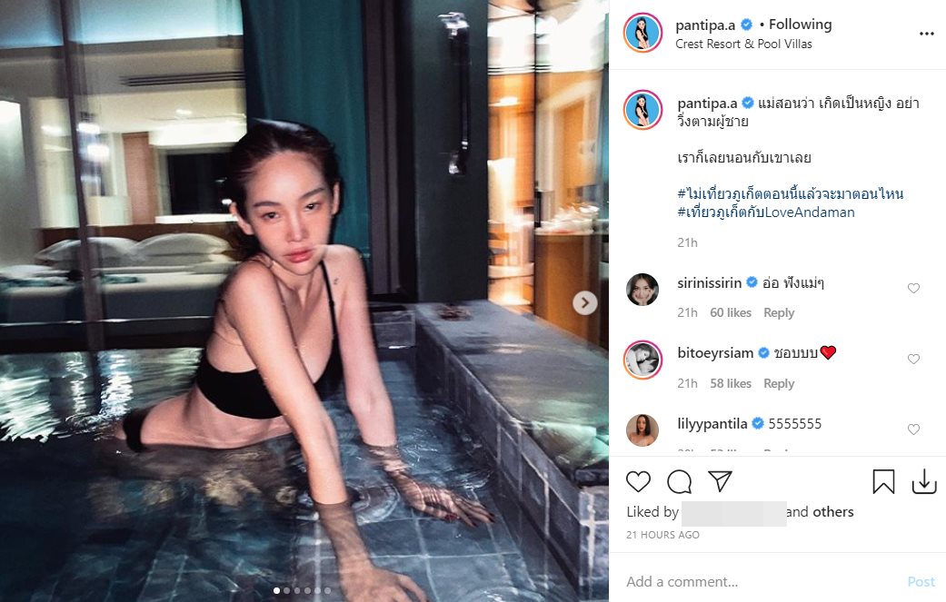 ยังคงยืนหนึ่งเรื่องแคปชั่นแซ่บ สำหรับ ปุ้มปุ้ย พรรณทิพา ภรรยาของหนุ่ม กวินท์ ดูวาล ที่ล่าสุดได้ควงคู่สามีไปเที่ยวทะเลภูเก็ต แล้วแข่งกันโพสต์ภาพเด็ดลง IG โดยสาวปุ้มปุ้ยเปิดตัวมาด้วยภาพในชุดว่ายน้ำสีดำเซ็กซี่ พร้อมข้อความว่า "แม่สอนว่า เกิดเป็นหญิง อย่าวิ่งตามผู้ชาย เราก็เลยนอนกับเขาเลย" ทำเอาแฟน ๆ กดไลก์กันรัว ๆ