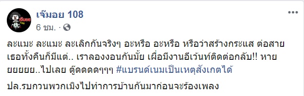 "ละแมะ ละแมะ ละเลิกกันจริง ๆ อะหรือ อะหรือ หรือว่าสร้างกระแส ต่อสายเธอทั้งคืนก็มีแต่.. เราลองงอนกันมั้ย เผื่อมีงานอีเว้นท์ติดต่อกลับ !! หายยยยยย..ไปเลย ตู๊ดดดด ๆๆๆ #แบรนด์เนมเป็นเหตุสังเกตได้ ป.ล. รบกวนพวกเมิงไปทำการบ้านกันมาก่อนจะร้องเพลง"