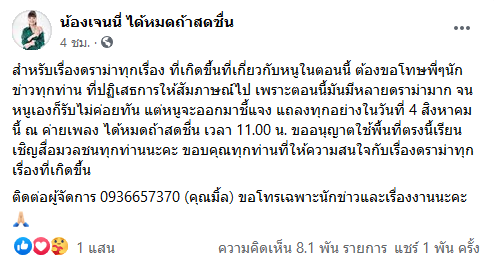 "สำหรับเรื่องดราม่าทุกเรื่องที่เกิดขึ้นที่เกี่ยวกับหนูในตอนนี้ ต้องขอโทษพี่ ๆ นักข่าวทุกท่าน ที่ปฏิเสธการให้สัมภาษณ์ไป เพราะตอนนี้มันมีหลายดราม่ามาก จนหนูเองก็รับไม่ค่อยทัน แต่หนูจะออกมาชี้แจง แถลงทุกอย่างในวันที่ 4 สิงหาคม นี้ ณ ค่ายเพลง ได้หมดถ้าสดชื่น เวลา 11.00 น. ขออนุญาตใช้พื้นที่ตรงนี้เรียนเชิญสื่อมวลชนทุกท่านนะคะ"