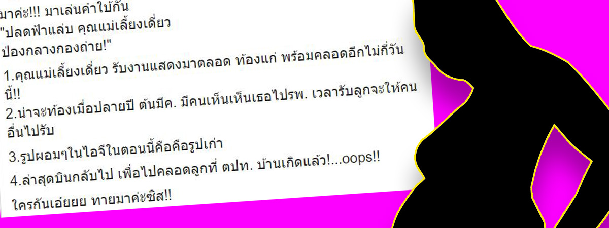 กลายเป็นประเด็นฮอต ๆ ให้คนจับตาอีกแล้ว สำหรับข่าวเมาท์อักษรย่อ คุณแม่เลี้ยงเดี่ยว ที่ตอนนี้จะเปลี่ยนเป็น "คุณแม่ลูกสอง" เพราะคนลือว่ากำลังตั้งท้อง ใกล้คลอดแล้ว มีข่าวระบุว่า คุณแม่เลี้ยงเดี่ยวคนนี้ ขอถอนตัวจากงานแสดงที่รับไว้เมื่อต้นปีที่ผ่านมา