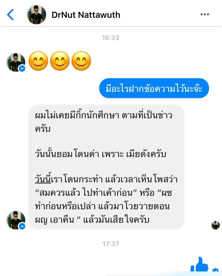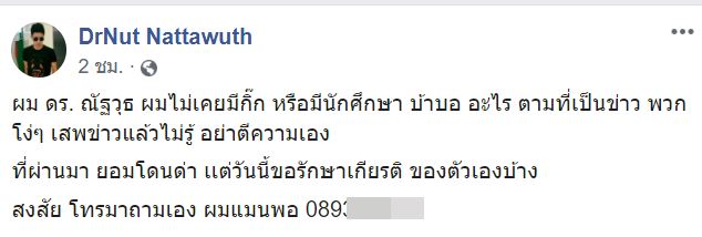 ล่าสุด (20 สิงหาคม 2563) ดร.ณัฐวุธ ก็ได้ทักมาชี้แจงผ่านเพจ เจ๊มอย 108 ระบุว่า "ผมไม่เคยมีกิ๊กนักศึกษา ตามที่เป็นข่าวครับ วันนั้นยอมโดนด่า เพราะเมียดังครับ วันนี้เราโดนกระทำ แล้วเวลาเห็นโพสต์ว่า "สมควรแล้ว ไปทำเค้าก่อน" หรือ "ผช ทำก่อนหรือเปล่า แล้วมาโวยวายตอน ผญ เอาคืน" แล้วมันเสียใจครับ"