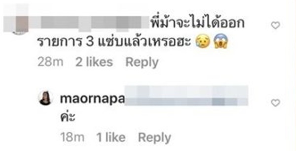 ไม่รู้คำว่าค่ะของพี่ม้า หมายถึงว่าจะไม่ได้เป็นพิธีกร หรือเป็นแค่การตอบรับเฉย ๆ ซึ่งเรื่องนี้คงต้องรอฟังประกาศอย่างเป็นทางการจากรายการ 3แซ่บ ต่อไป