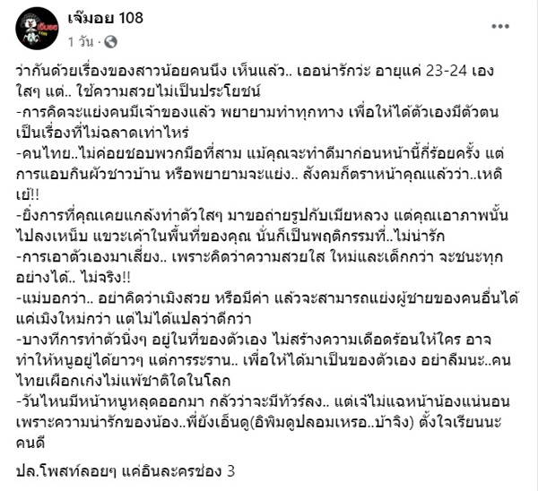 มีข่าวชวนเผือกมาอีกแล้ว เมื่อล่าสุด (30 สิงหาคม 2563) เจ๊มอย 108 ได้มีการโพสต์ว่า สาวน้อยคนหนึ่งอายุแค่ 23-24 ปี คิดจะแย่งคนมีเจ้าของแล้ว พยายามทำทุกทาง เพื่อให้ตัวเองมีตัวตน แอบกินผัวชาวบ้าน ยิ่งการที่คุณเคยแกล้งทำตัวใส ๆ มาขอถ่ายรูปกับเมียหลวง แต่คุณเอาภาพนั้นไปลงเหน็บเป็นพฤติกรรมที่ไม่น่ารัก การเอาตัวเองมาเสี่ยง เพราะคิดว่าความสวยใส ใหม่ และเด็กกว่าจะชนะทุกอย่างได้ ไม่จริง อย่าคิดว่าสวยหรือมีค่าแล้วจะสามารถแย่งผู้ชายของคนอื่นได้