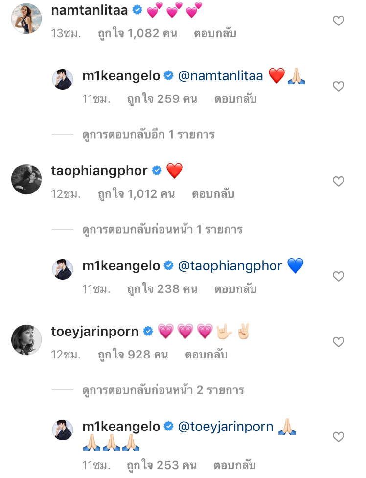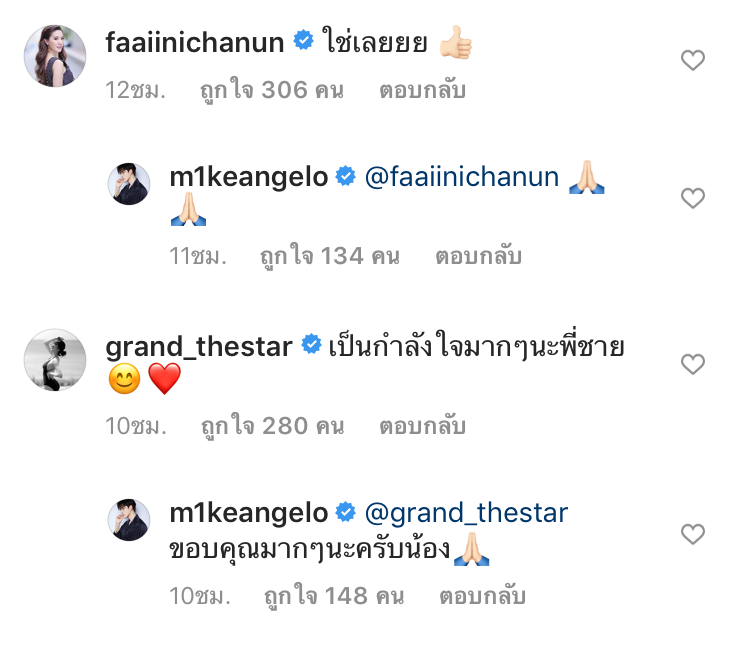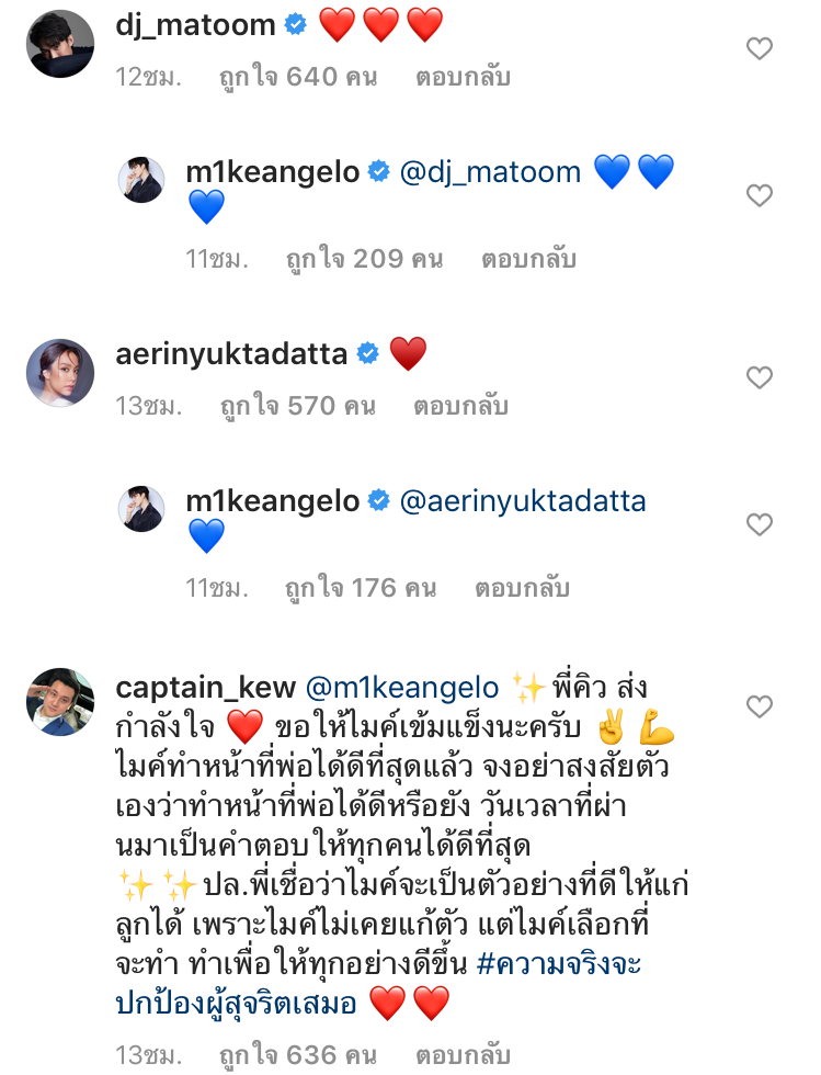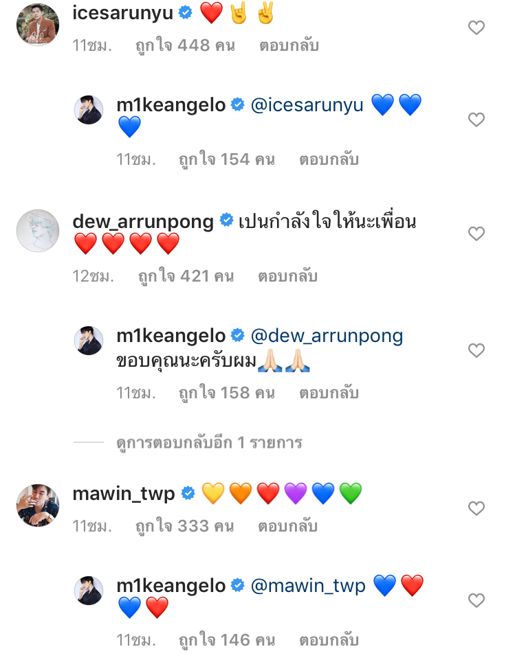 อย่างไรก็ตาม มีเพื่อน ๆ พี่ ๆ ในวงการบันเทิงเข้ามาให้กำลังใจจำนวนมาก รวมถึงซุปตาร์สาว อั้ม พัชราภา ก็เข้ามาให้กำลังใจน้องชายด้วยการส่งอีโมจิหัวใจสีแดงแทนความห่วงใยและกำลังใจ ขณะที่ไมค์ก็ส่งหัวใจตอบกลับเช่นกัน ทำเอาแฟนคลับปลื้มใจมาก ๆ