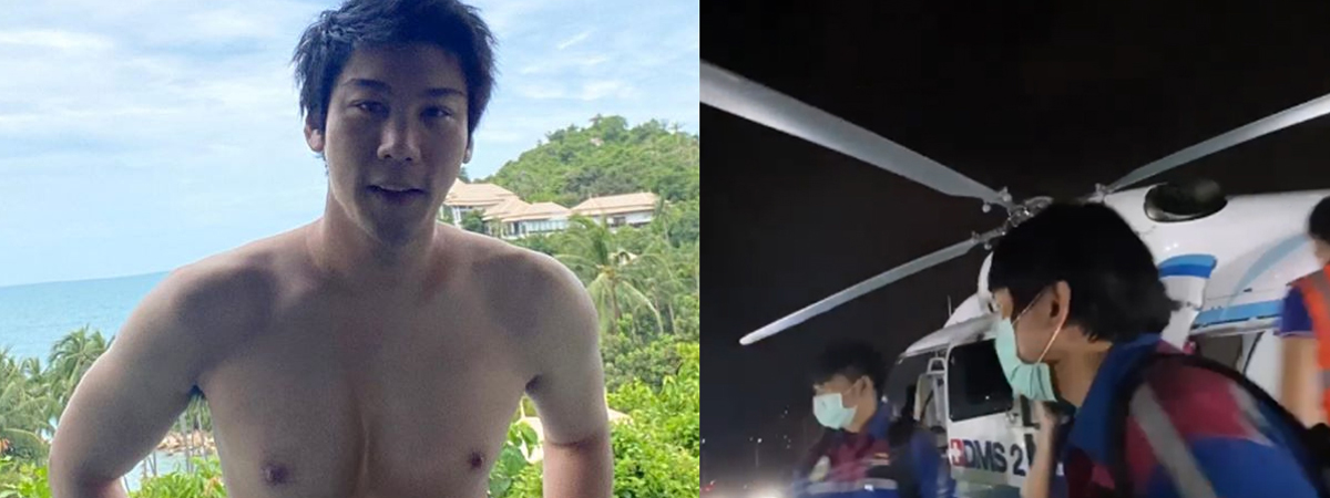 ไฮโซแชมป์ ถูกหามขึ้นเฮลิคอปเตอร์ รักษาตัวต่อที่กรุงเทพมหานคร หลังจากที่ขับรถชนสะพานจนยับ เจ้าตัวชี้ ไม่เป็นอะไรมากแล้ว