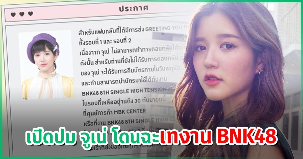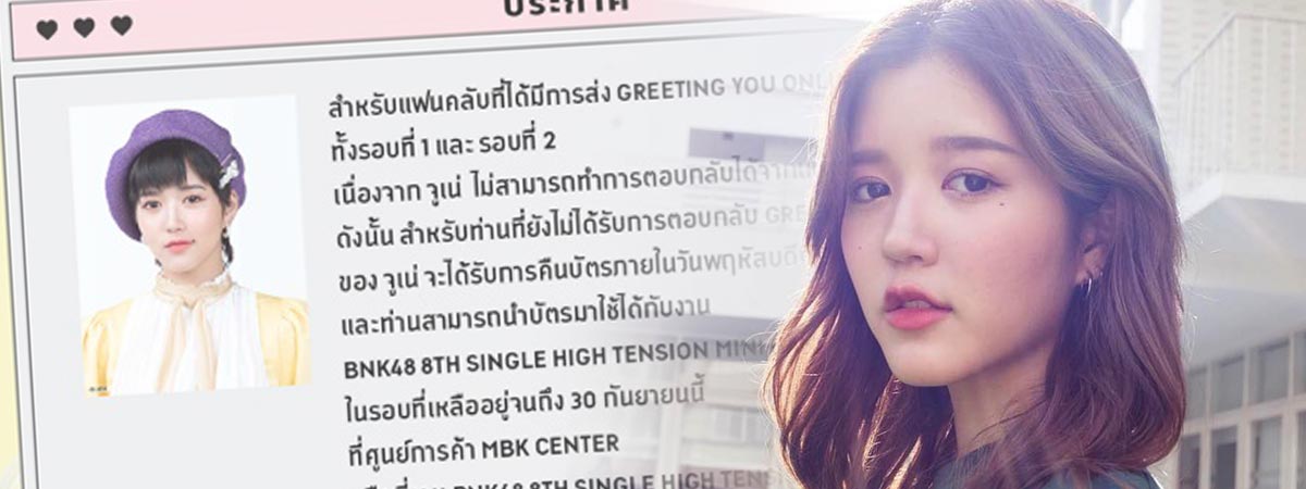 กลายเป็นประเด็นดราม่าร้อน ๆ กันเลยทีเดียว สำหรับเรื่องราวของ จูเน่ BNK48 หลังมีประกาศจาก BNK48 Official Application ว่าด้วยเรื่องการส่ง Greeting You Online ของ จูเน่ ทั้ง 2 รอบ โดยระบุว่า จูเน่ไม่สามารถทำการตอบกลับได้จากเหตุผลส่วนตัว แฟนคลับที่ยังไม่ได้รับการตอบกลับ จะได้รับบัตรคืน และสามารถนำมาใช้ได้ในงานจับมือรอบอื่น ๆ