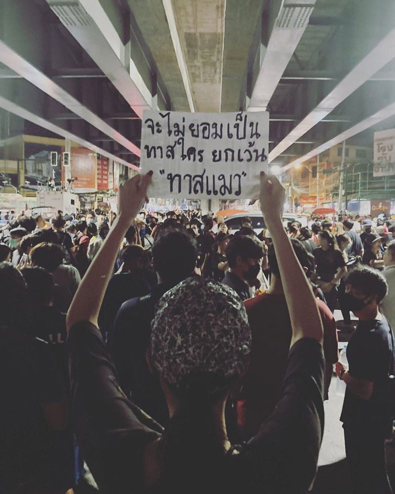 เช่นเดียวกับนักแสดงสาว แตงโม นิดา ที่ล่าสุด (19 ตุลาคม 2563) เดินทางไปร่วมชุมนุม 19 ตุลา พร้อมโพสต์รูปยืนหันหลังชูป้ายที่มีข้อความว่า จะไม่ยอมเป็นทาสใคร ยกเว้น "ทาสแมว" เป็นข้อความที่ตรงกับเจ้าตัวจริง ๆ เพราะสาวแตงโมก็เป็นอีกคนที่ทั้งรักทั้งหลงเจ้าเหมียวมาก เลี้ยงไว้หลายตัวทีเดียว